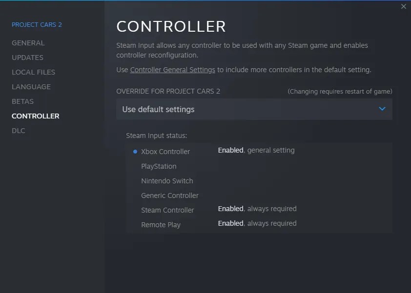 - Pada menu controller, pastikan Override for Project CARS 2 terpilih ke Use Default Settings.