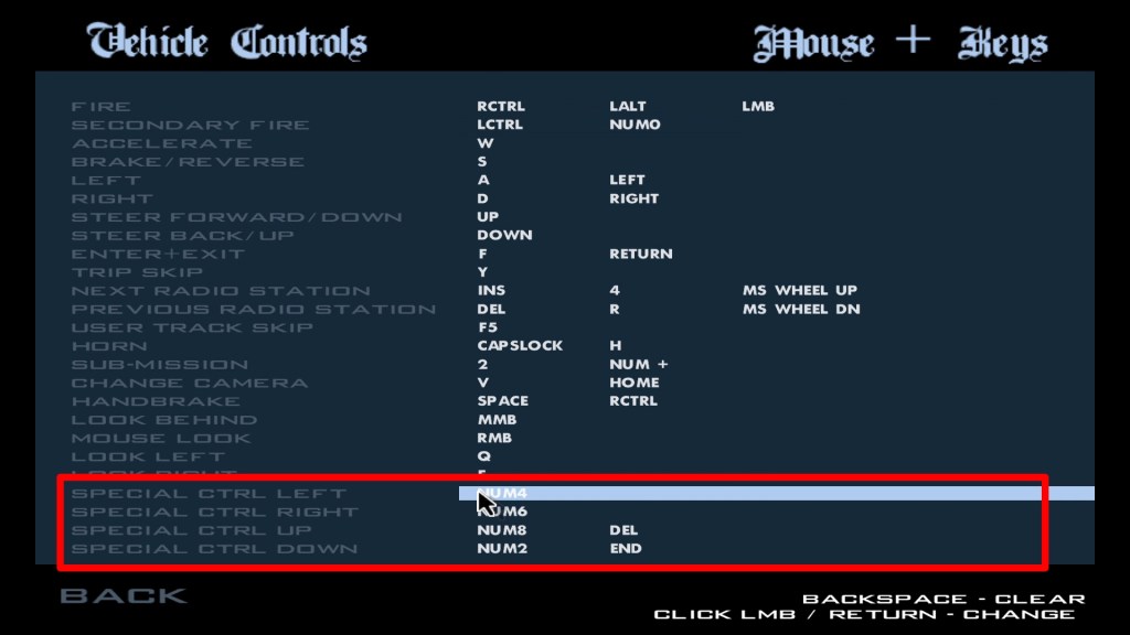 Untuk memainkan LowRider Challenge ini, kalian perlu menggunakan tombol Numpad (jika main di PC) dan Analog Kanan (di Console / dengan Controller). Jika keyboard PC-mu tidak memiliki Numpad, kamu bisa remap kontrol-nya di halaman Options > Controller Options > Redefine Controls > Vehicle Controls. Berikut bagian yang perlu kamu ubah key binding-nya :
